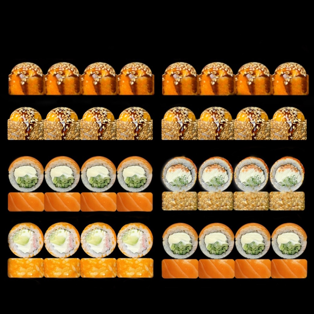 Філадельфія Класік Х2, Каліфорнія Лосось Гриль, Каліфорнія Класік, Запечений рол з лососем в кунжуті, Запечений рол з креветкою в ікрі